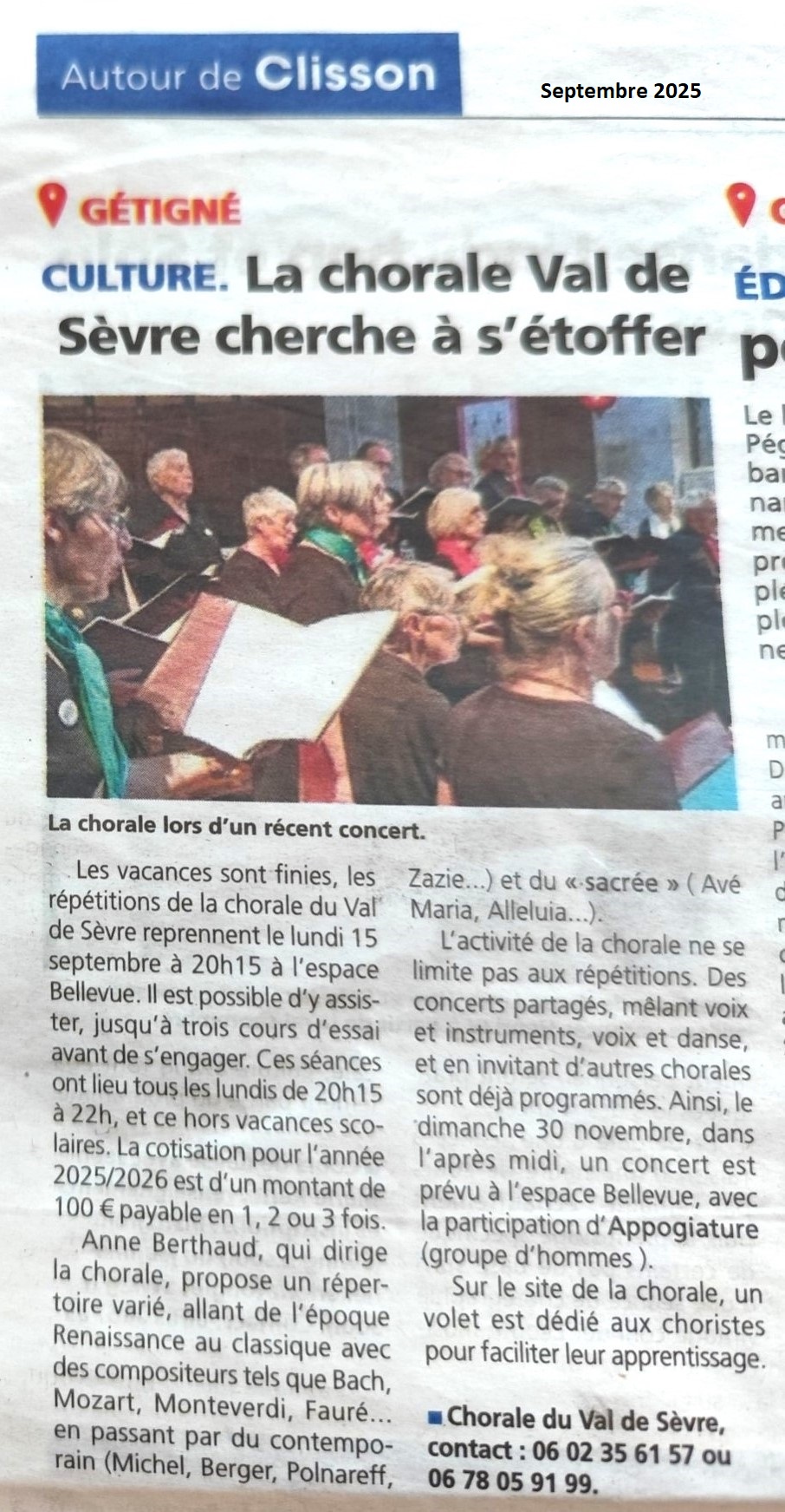 Pour mieux découvrir notre chorale, avant de vous inscrire, vous pouvez assister à une ou deux répétitions gratuitement. Nous vous invitons aussi à nous contacter pour vous renseigner sur les co-voiturages possibles à partir des communes d’origine de nos choristes. La chorale se retrouve chaque lundi de 20h00 à 22h00 à l’Espace Bellevue de Gétigné.